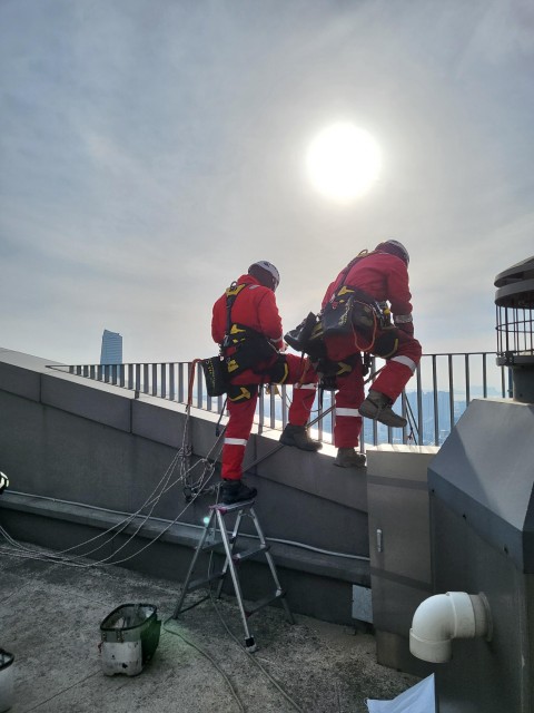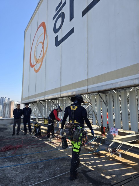 한화생명빌딩 습기찬 유리 교체 자일로프공사(고소작업차량 진입불가지역)