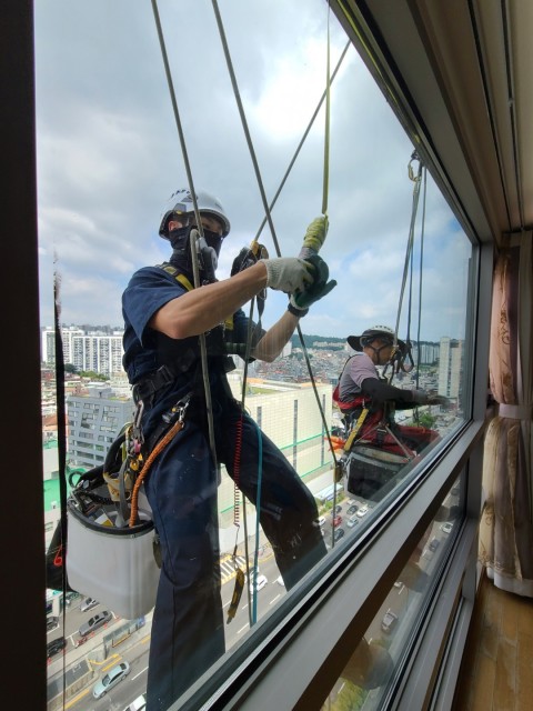 정관그리나오피스텔 파손 유리 교체 자일로프공사(엘리베이터 인양 불가)