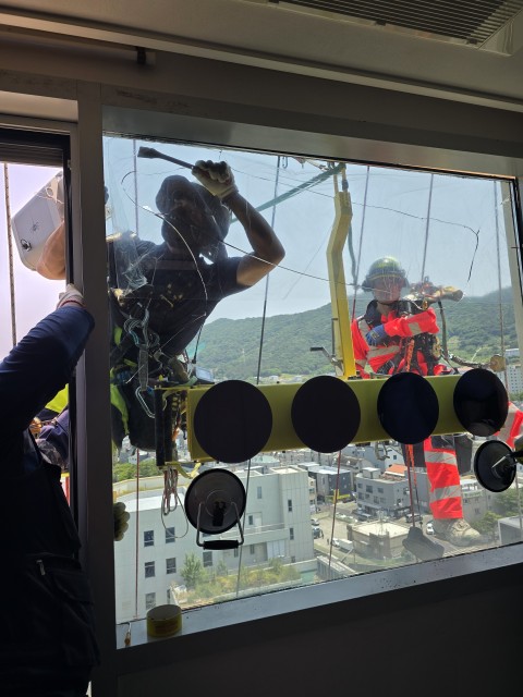 해운대 60층 176m 고층빌딩 파손 유리 교체 공사